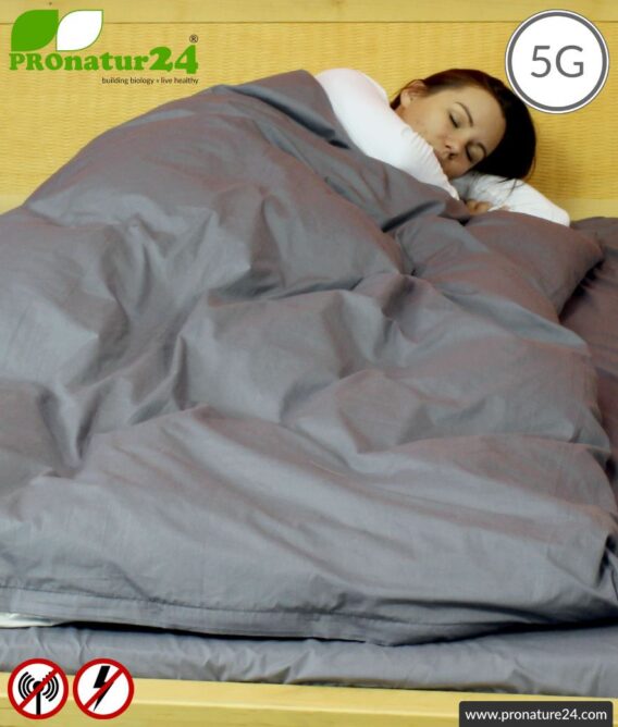 This linen is sewn with the same shielding fabric as our ElectrosmogElectrosmog is a colloquial term for all emissions from electric, magnetic, and electromagnetic fields. More PRO sleeping bag and shielding blanket for relaxing. The linen protects from LF electric alternating fields and can be grounded. It also offers effective protection from radiation from WIFI, cell phones, smartphones, DECT, LTE, etc. with an attenuation of up to 41 dB.