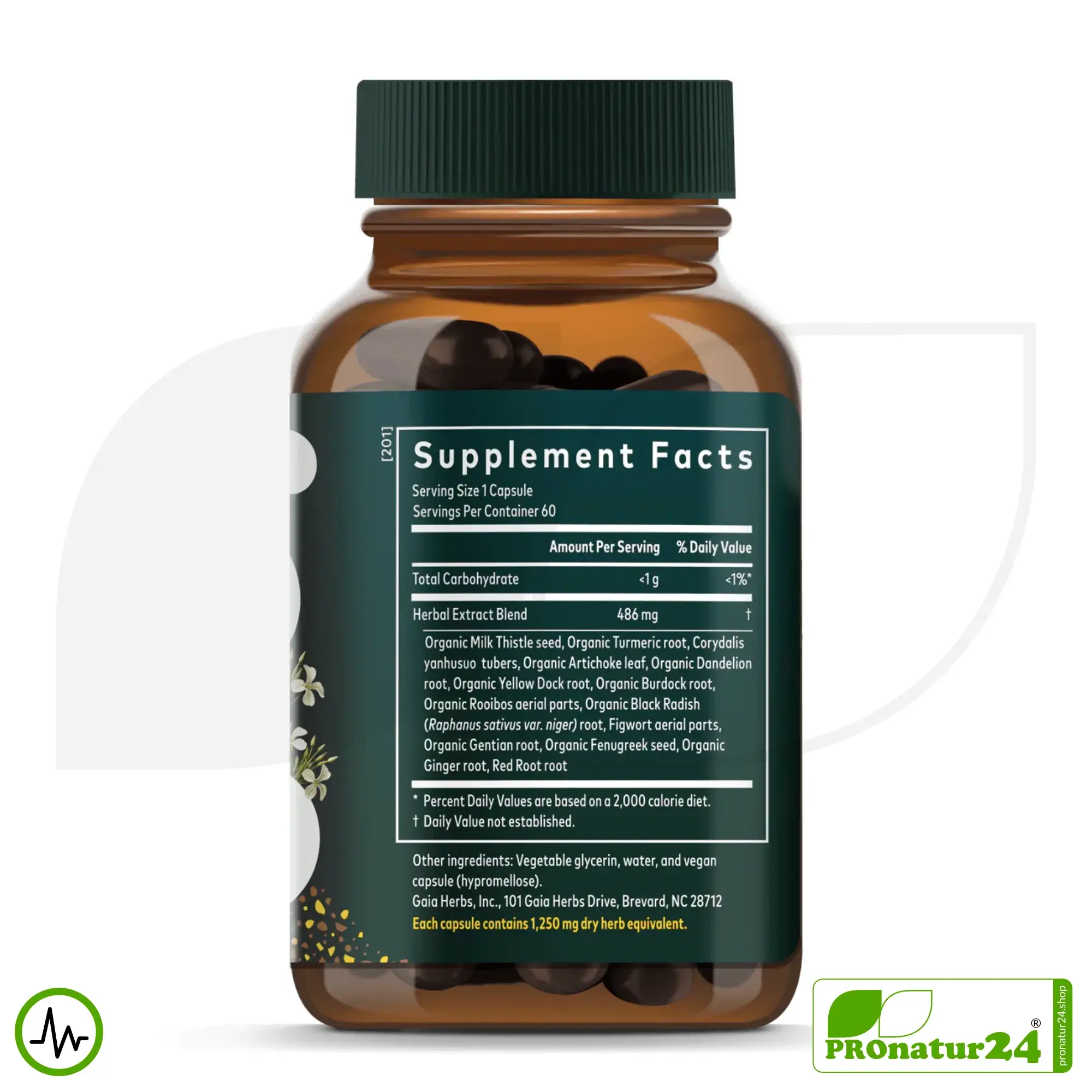 Extract Blend [Milk Thistle Seed (Silybum marianum), Turmeric Root (Curcuma longa), Corydalis Yanhusuo Tuber (Corydalis yanhusuo), Artichoke Leaf (Cynara scolymus), Dandelion Root (Taraxacum officinale), Yellow Dock Root (Rumex crispus), Burdock Root (Arctium lappa), Rooibos (Aspalathus linearis), Black Radish Root (Raphanus sativus var. niger), Figwort (Scrophularia nodosa), Yellow Gentian Root (Gentiana lutea), Fenugreek Seed (Trigonella foenum-graecum), Ginger Root (Zingiber officinale), Red Root (Ceanothus americanus)], Hydroxypropyl Methylcellulose (Capsule Shell), Glycerin, Water