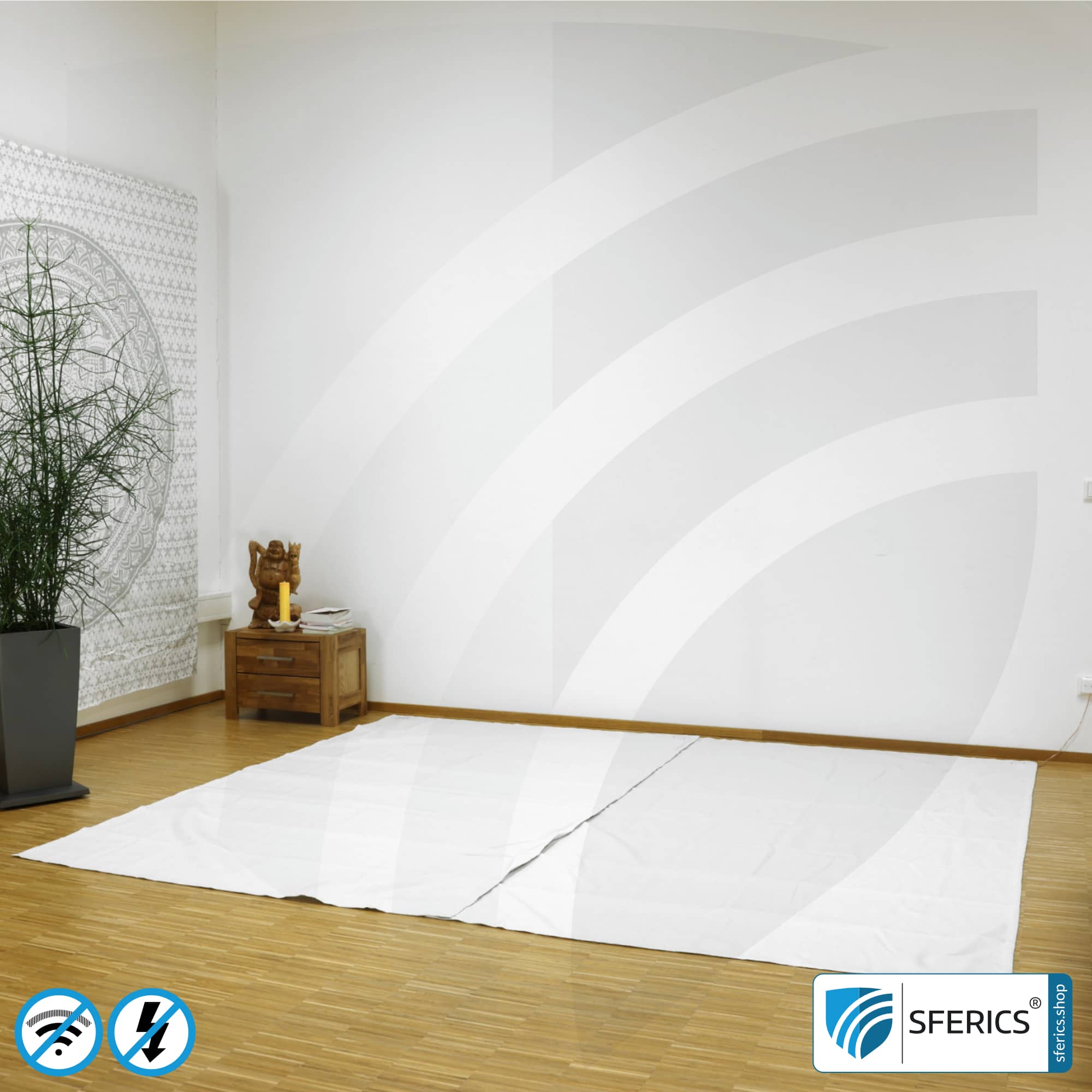 Our floor carpet pad is insensitive to mechanical pressure, i.e. walking on it or placing a bed on it is possible without any problems. Furthermore, the stainless steel threads interwoven in the shielding material are not insulated and thus electrically contactable. Therefore this floor carpet pad is groundable and can shield electrical fields from grounded cables or the ceiling lighting of the apartment under the bedroom.